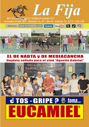 PANUCHO (Arg-2017) macho castaño por Treasure Beach y Pre Compañía (Easing Along). Clásico “Jimmy Jairala Vallazza”. Décima tercera victoria en 21 salidas. Jinete: Manuel González Jr. (Ecu); Preparador: Abelardo Escobar (Ecu); Stud: Agustín Gabriel. Distancia 1.700 metros. Tiempo: 1.47.40